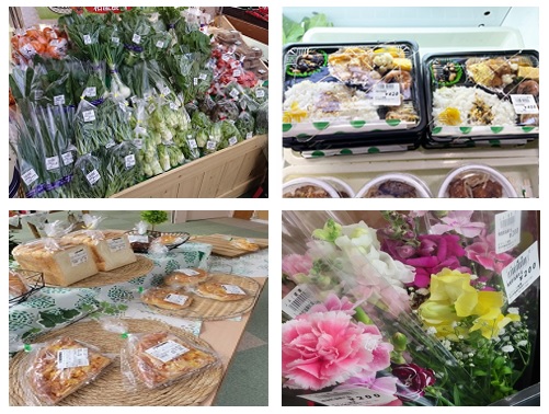 農産物(野菜・花・果物)、味噌、弁当、お土産品、菓子類